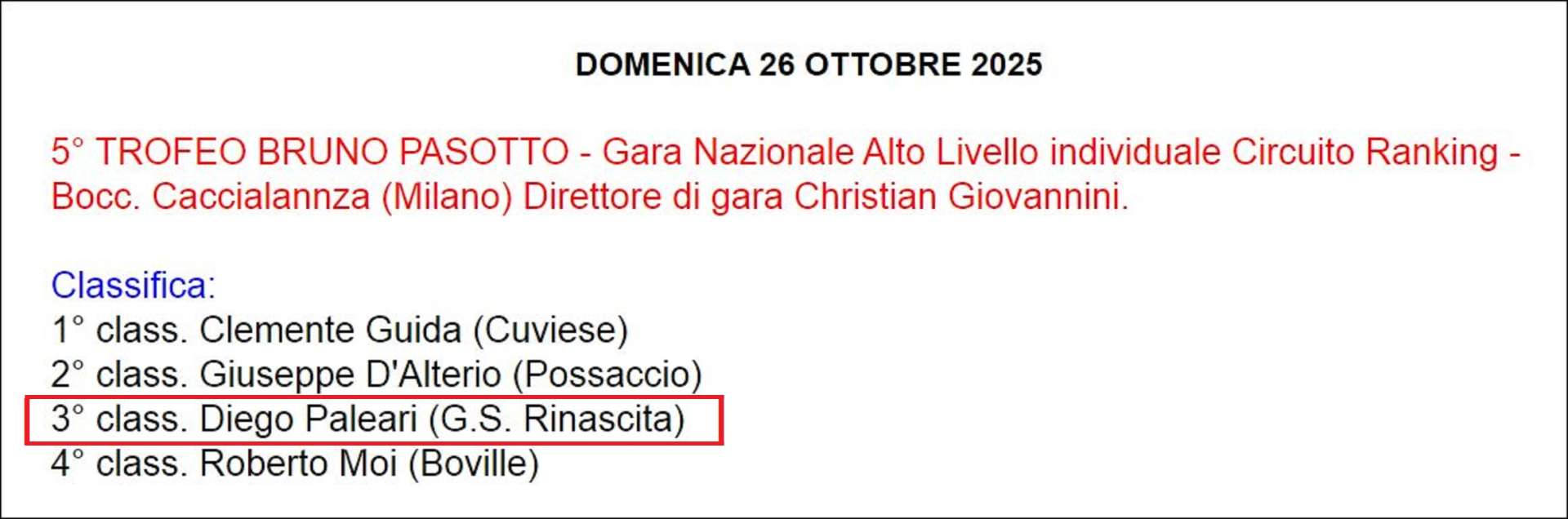 Non meno importante è stato il traguardo raggiunto a Milano, domenica 26 ottobre, dove si è tenuto il 5° TROFEO BRUNO PASOTTO, una gara individuale nazionale Alto Livello Circuito Ranking, organizzata dall'ASD BOCC. CACCIALANZA.