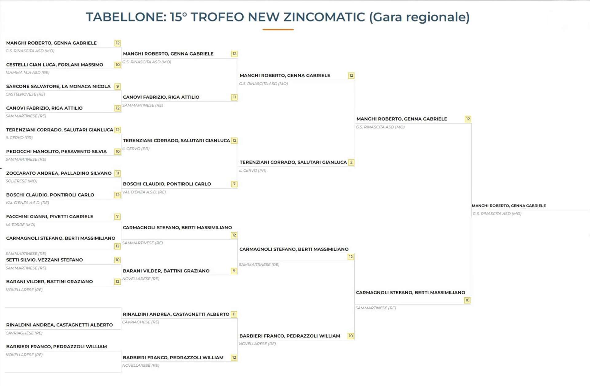 La finale è stata la degna conclusione di un torneo impeccabile. Qui, Manghi e Genna hanno affrontato la forte coppia della Società Sammartinese, composta da Stefano Carmagnoli e Massimiliano Berti. In un incontro ad alta tensione, i nostri atleti hanno saputo imporre il proprio gioco, prevalendo sugli avversari e conquistando così il titolo del 15° Trofeo New Zincomatic.