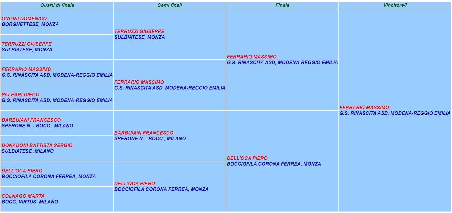 Forte della vittoria nel derby societario e conscio dei propri mezzi, Ferrario non si è più fermato. Con una condotta di gara impeccabile, ha superato d'autorità la semifinale, approdando alla finalissima contro un avversario di assoluto prestigio: Piero Dell'Oca, portacolori della storica Bocciofila Corona Ferrea di Monza.