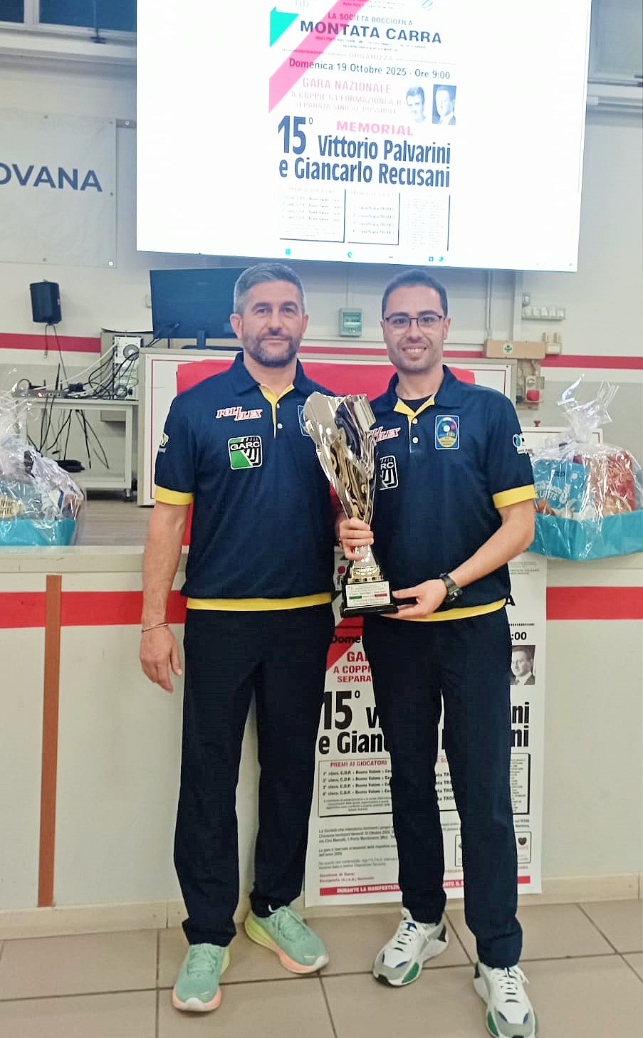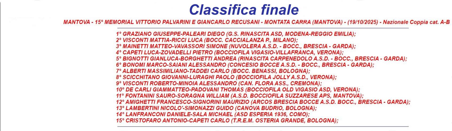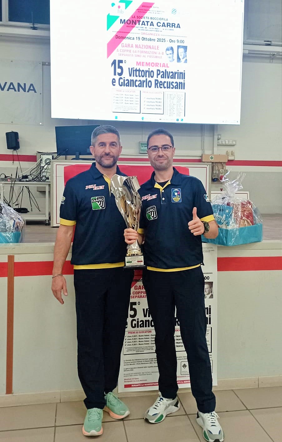 Porto Mantovano (MN) - Un successo eccezionale per il G.S. Rinascita Bocce di Budrione di Carpi (MO) è arrivato domenica 19 ottobre 2025 presso il bocciodromo della Società Bocciofila Montata Carra. La coppia formata da Diego Paleari e Giuseppe Graziano ha sbaragliato la concorrenza, aggiudicandosi il prestigioso 15° Memorial Vittorio Palvarini e Giancarlo Recusani, gara nazionale di specialità Coppia.